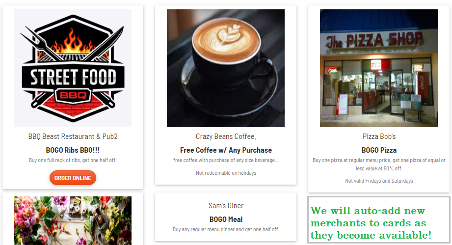 Scannable QR Code takes the customer to view all the offers & deals. This allows us to continue adding new merchants with new offers, even after we've shipped the cards to you! Click the image above to view the sample digital version of the card deals.